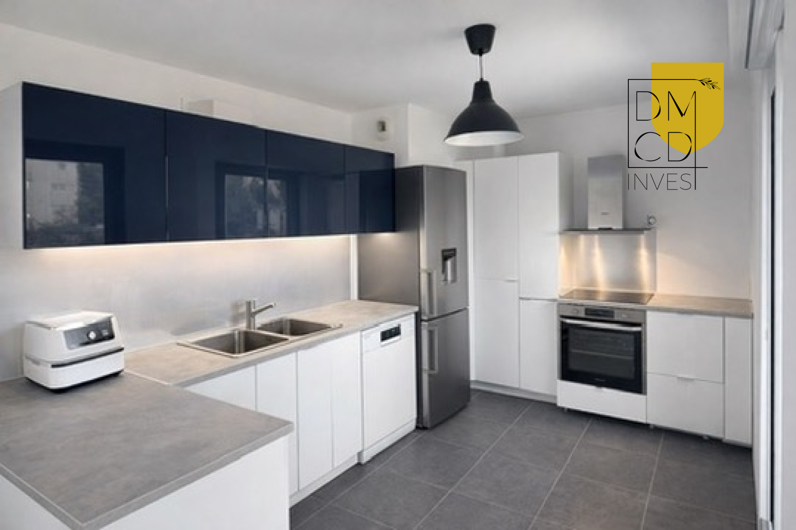 La cuisine moderne, entièrement équipée, s’intègre harmonieusement à l’ensemble pour un quotidien pratique et convivial.