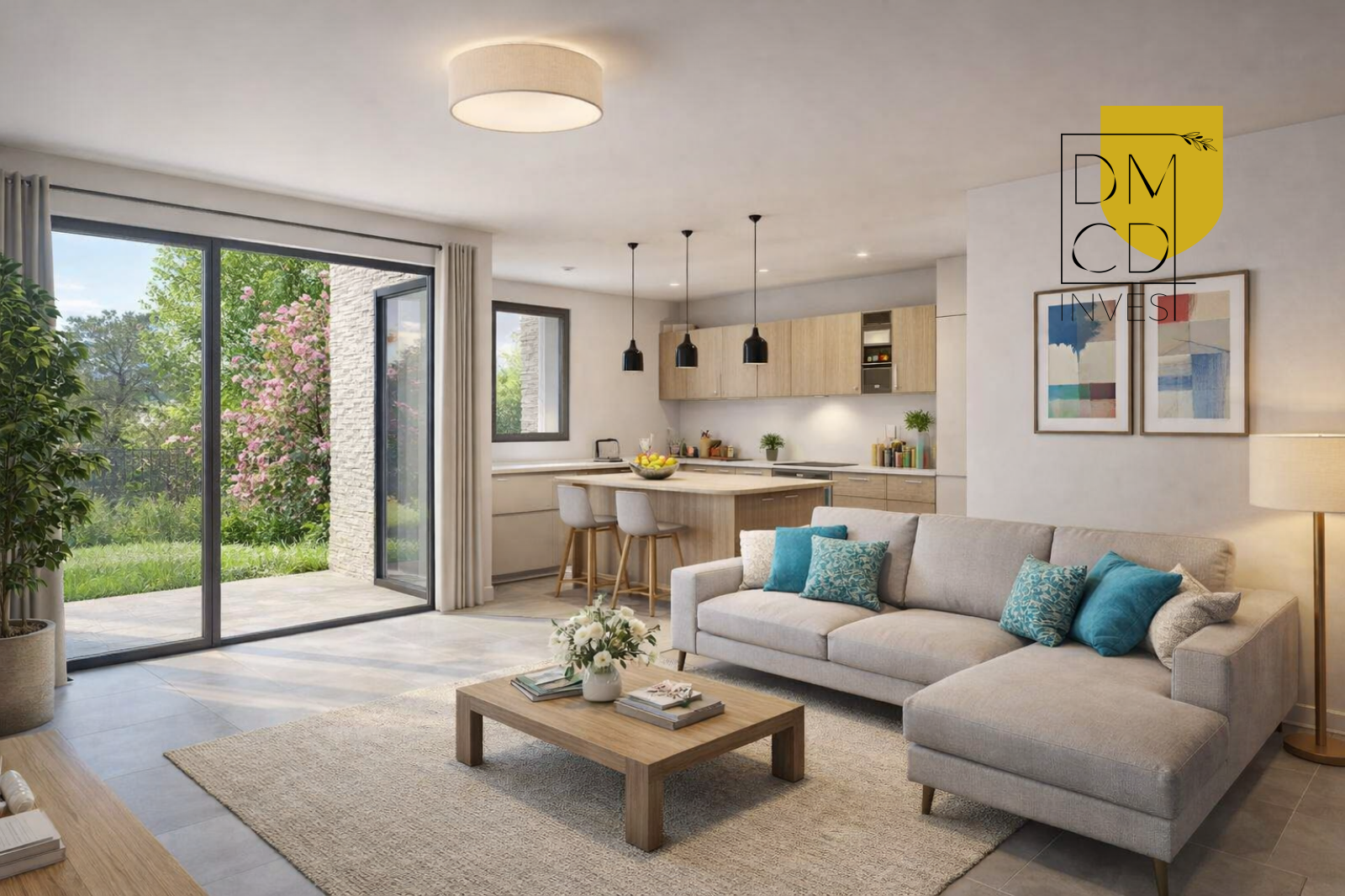L’ensemble s’ouvre sur une large baie vitrée donnant sur la terrasse (13,8 m²) et le jardin privatif, créant une parfaite continuité intérieur/extérieur.