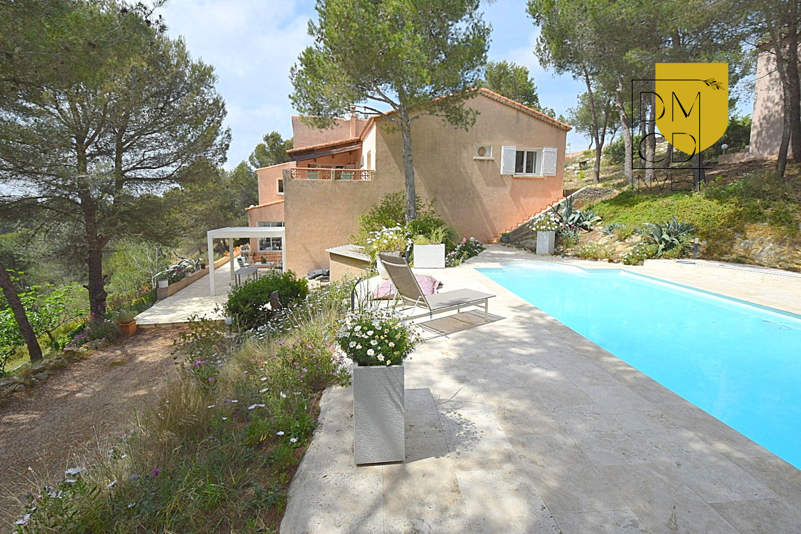 Sur un terrain arboré d’environ 4000 m², planté de pins et baigné de lumière, cette propriété vous offre un cadre de vie rare, à l’abri des regards, dans un environnement privilégié, avec la vue mer en toile de fond.